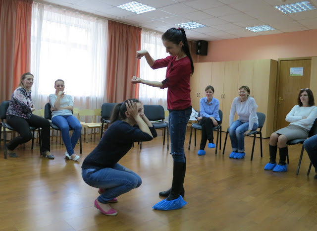 я просила каждую пару изобразить пантомимой сюжет, чтобы был один живой персонаж и один предмет.